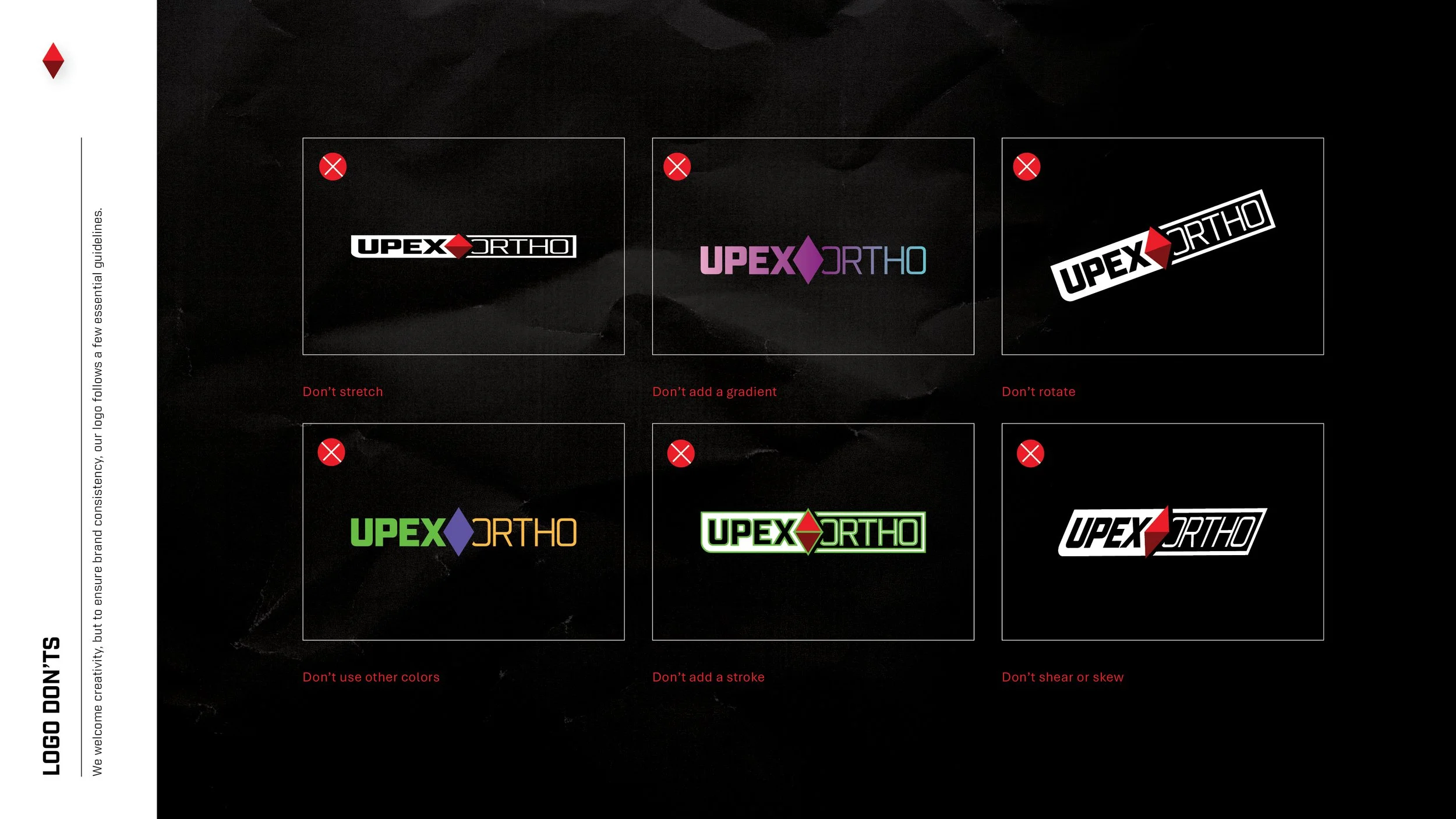 Upex Ortho’s visual system was shaped by the discipline and precision inherent to orthopedics. The identity draws on structured geometry, sharp lines, and refined balance to convey both trust and strength. Just as the industry requires both resilience and innovation, the design language combines a stoic, bold palette with clean forms and timeless typography. The result is a look that is immediate, confident, and enduring, establishing an identity positioned to become a modern classic within the orthopedic space.